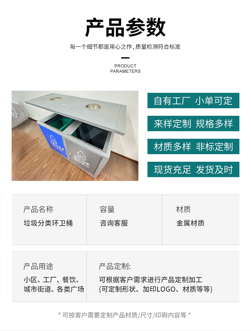 溫州東鴻金屬制造有限公司提供不銹鋼戶外垃圾箱,不銹鋼公園景區(qū)分類雙桶垃圾箱,不銹鋼大容量商用環(huán)衛(wèi)垃圾箱適用于小區(qū)、工廠、餐飲、城市街道、各類廣場(chǎng)、企業(yè)單位、花園、公園、學(xué)校、碼頭、風(fēng)景旅游區(qū)等公共場(chǎng)所,可按客戶的需要定投產(chǎn)品尺寸、材質(zhì)和印刷內(nèi)容,咨詢電話0577-88321654。